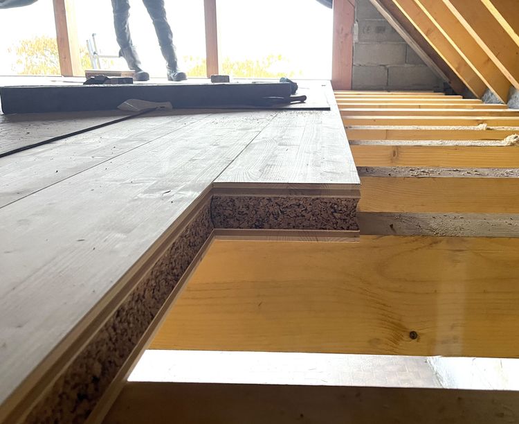 Pour remplacer le plancher détruit dans l’incendie, nous avons opté pour la mise en œuvre d’un plancher isolé liège avec finition bois deux faces, posé sur solives apparentes – évitant ainsi de multiplier les couches de finition en sol et plafond.