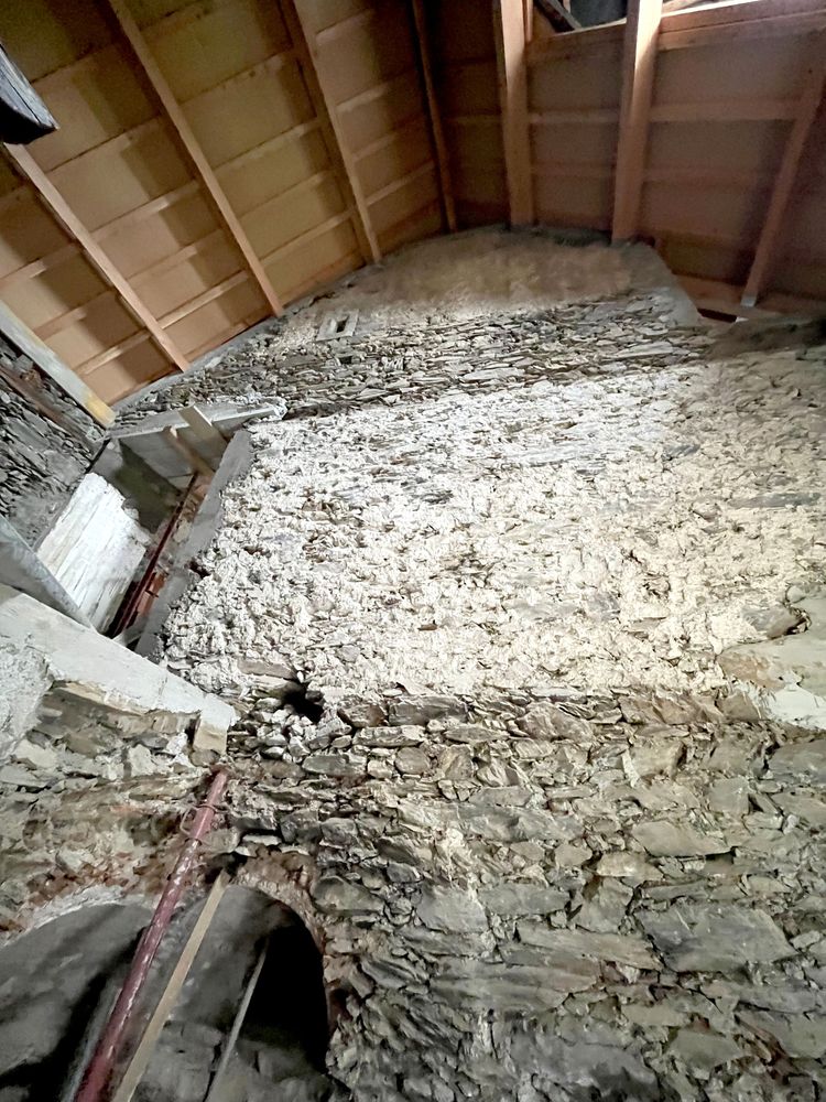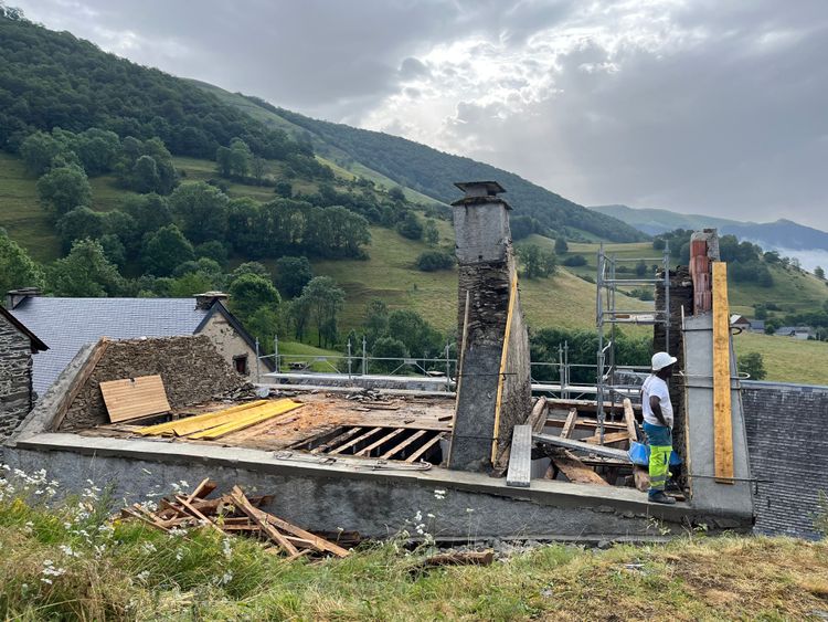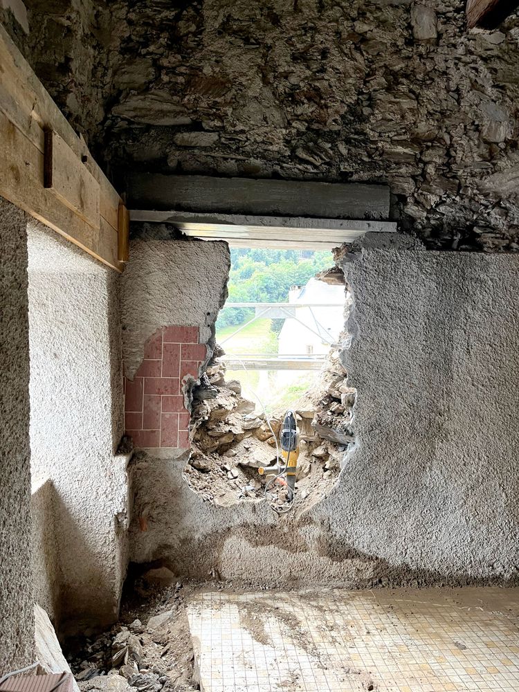 Cette restructuration intérieure globale est celle d’une maison ancienne suspendue à flanc de montagne, dont la façade Ouest est totalement enterrée. Située en contrebas de l’église du village, en zone de patrimoine sauvegardée, l’Architecte des Bâtiments de France n’a permis aucune ouverture ni modification extérieure à l’exception de la création d’une porte vers une terrasse créée en pignon Sud. La seule façade bénéficiant de lumière et d’ouverture reste la façade Est.