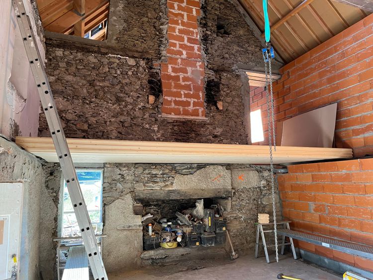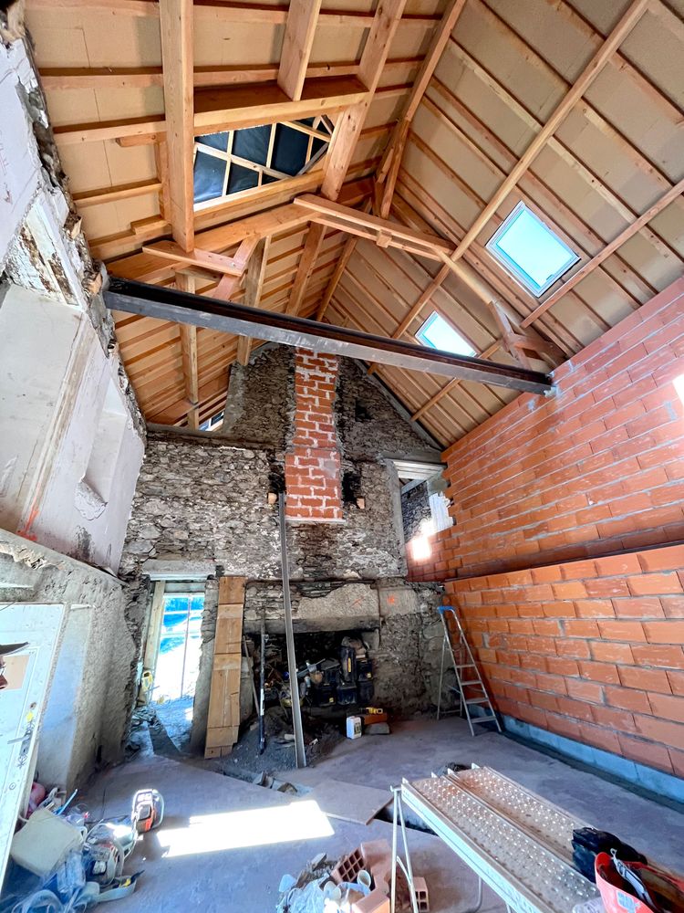Le mauvais état général de tous les planchers et de la charpente ayant nécessité un curage total de la maison, nous avons choisi la mise en œuvre d’un plancher dalle bois massif en remplacement du plancher traditionnel de l’étage. Cette solution a permis de minimiser l’épaisseur du plancher et d’obtenir des aspects de surface et sous-face finies.